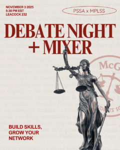 Join MPLSS and McGill Political Science Students’ Association for a debate night + mixer! This is a great opportunity to refine your debate skills while expanding your network.